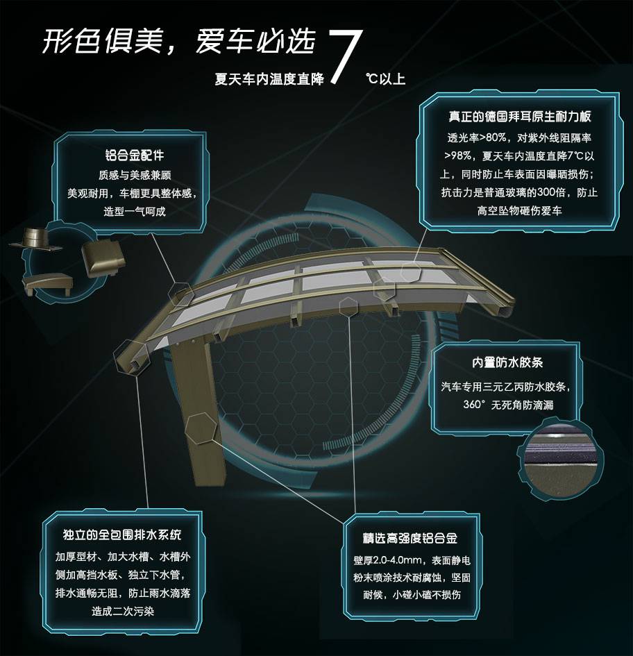 爱游戏最新官网-爱游戏(中国)车棚系列全部采用高品质、高强度铝合金材料精加工而成,具备的氧化保护能力,不生锈,表面特殊的工艺处理,大大提高了车棚的使用寿命。顶棚使用添加了防止紫外线涂层的德国拜耳耐力板,降低了来自紫外线的分解,历久弥新,成就了优越的耐候性。